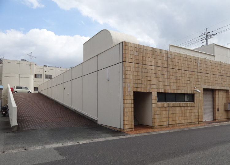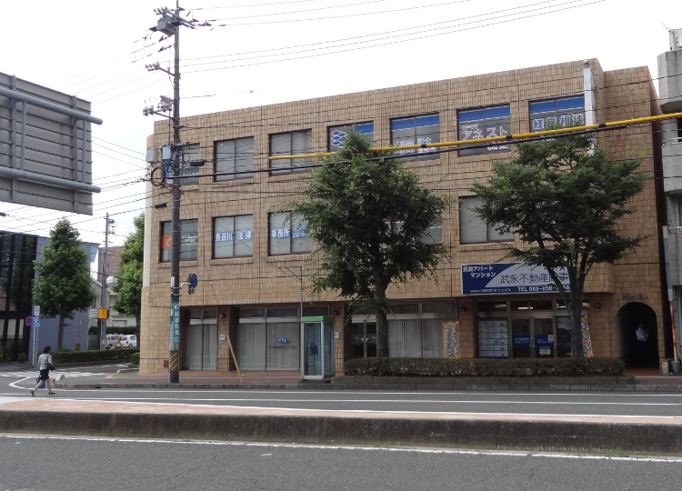 当事務所の外観です。ビル2階にオフィスがあります。入口は道路沿いの右側にあります。駐車場は2階部分にあり、オフィスへ続いています。